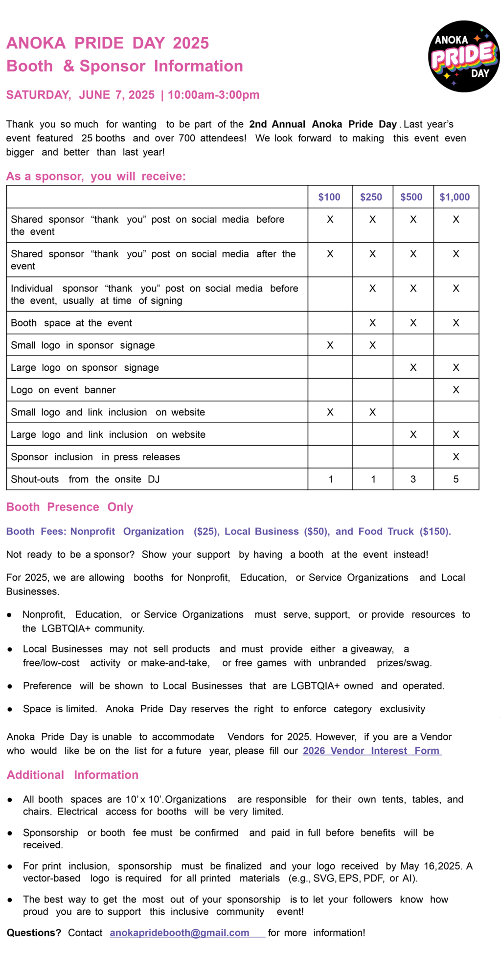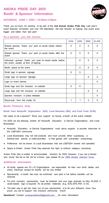 We are excited to partner with you to make Anoka Pride Day the BEST event possible.